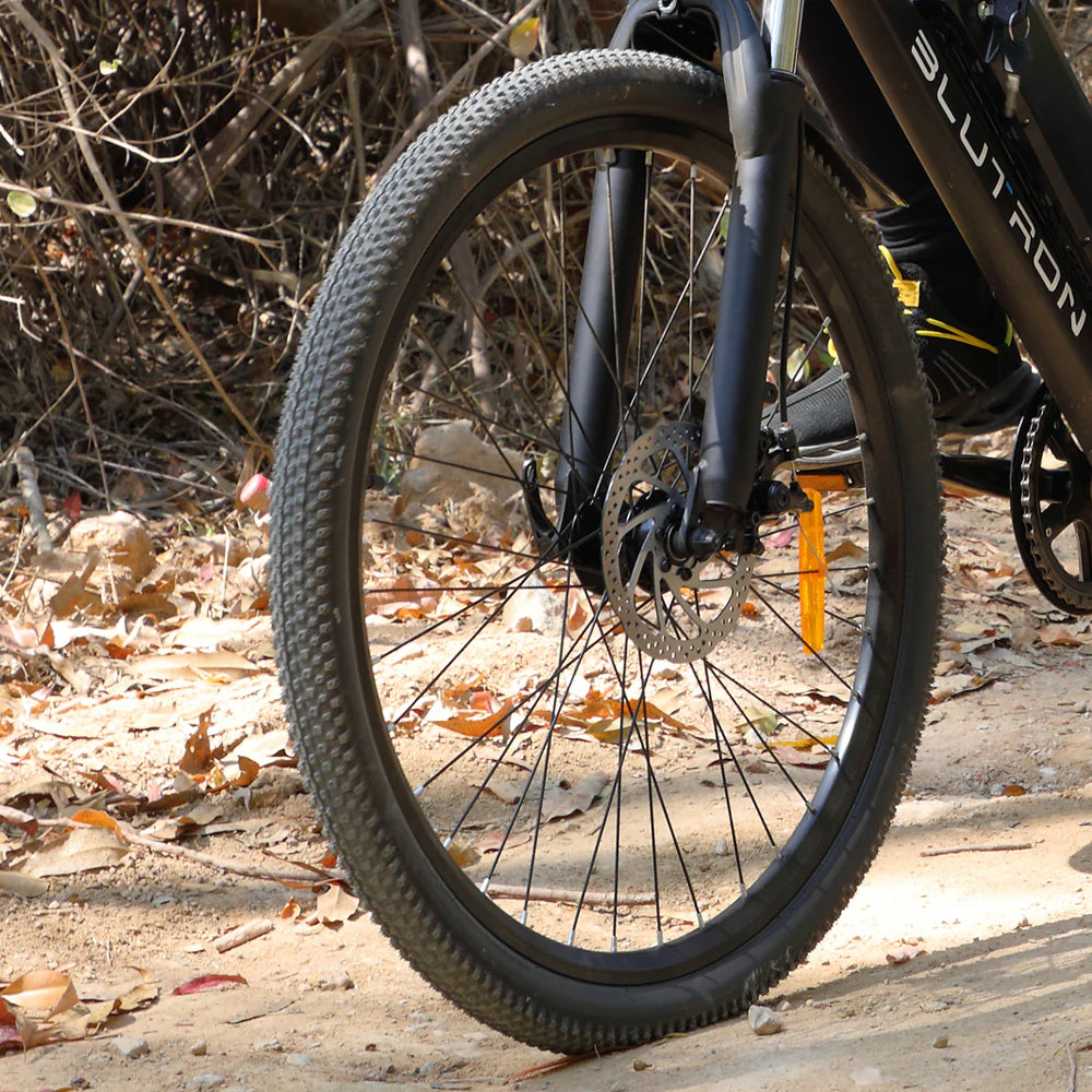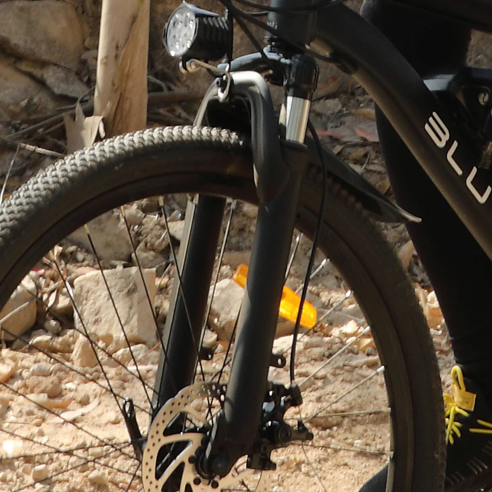 The front suspension absorbs shocks and bumps, providing added comfort on rough surfaces and uneven trails. It enhances control and stability, ensuring a smoother and more enjoyable ride.