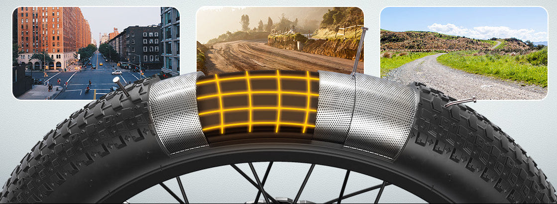 20” x 3” fat tires provide excellent grip and stability. Ride confidently on pavement, gravel, or mud. Puncture-resistant design reduces maintenance worries.