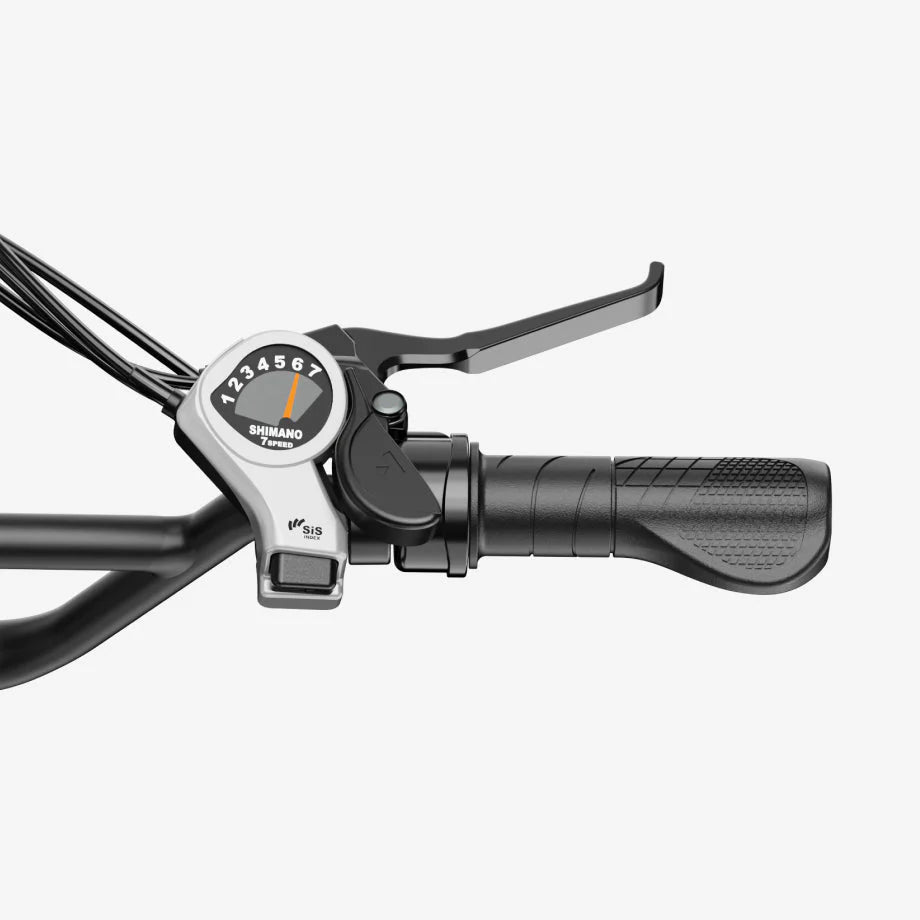 The Shimano 7-speed gearbox offers seamless shifting, while the motorcycle-style hand-twist Throttle provides easy control.
