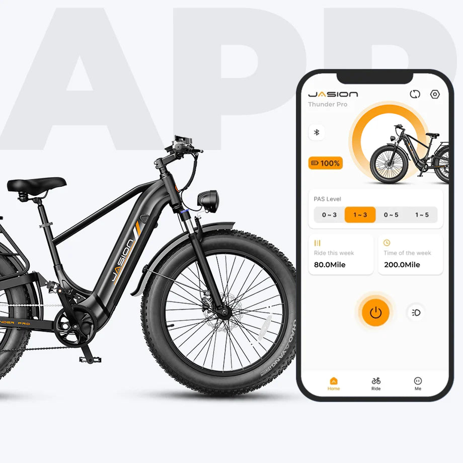 Fat tire eBikes are perfect for camping trips and outdoor escapes. Wide tires and stable suspension handle dirt roads, gravel paths, and campground terrain with ease—making it simple to carry gear, explore nearby trails, or cruise around the campsite in total comfort. Master Every Trail. Own the Ride. Thunder Pro ST’s upgraded motor delivers 1200W of sustained power, peaking at 2000W, with an impressive 115 N·m of torque to take on steep climbs and rough terrain with ease. Accelerate from 0–20 mph in just 5 seconds, enjoying strong, responsive power that keeps every ride smooth, controlled, and effortlessly confident. 2000W Peak Next-Level Battery Performance Equipped with a 1040Wh battery, Thunder Pro ST delivers a top speed of 35 mph and a maximum range of up to 90 miles, making it ideal for long commutes or all-day adventures. With fast charging from 15% to 80% in just 5 hours, you spend less time waiting and more time riding. Go farther, ride faster, and enjoy every journey without limits. 52V 20Ah Battery Full-Terrain Suspension for Any Ride A responsive front suspension and upgraded rear soft-tail system absorb bumps and rough terrain for a smoother, more comfortable ride. Built to handle hard landings and tough trails, the rear suspension keeps the frame stable while reducing wear and maintenance. Paired with 26″×4″ fat tires, it delivers confident control and all-terrain comfort—so you can focus on the ride, not the road. Control Isn’t Optional — It’s Standard. Upgraded front and rear 180mm hydraulic disc brakes deliver powerful, precise stopping control on your electric bike. The moment you squeeze the lever, you get instant, consistent response—whether you’re riding city streets, off-road trails, or facing wet and rough terrain. No hesitation, no guesswork—just total eBike braking control when it matters most. 90-Mile Long Range Go further without limits. With up to 90 miles of range, Thunder Pro ST is built to carry you across long commutes, open roads, and off-road terrain—no range anxiety, just pure freedom. 6_c436f557-744f-4bfe-ba1f-0ec200e9584a PAS Levels Corresponding Speed and Range PAS-1 Avg.Spd.9.3Mph Range:90Miles PAS-2 Avg.Spd.16Mph Range:69Miles PAS-3 Avg.Spd.20Mph Range:58Miles PAS-4 Avg.Spd.30Mph Range:47Miles PAS-5 Avg.Spd.38Mph Range:45Miles The results above were obtained with a rider weighing 80kg, in a flat road environment at 33°C. Please note that the cruising range can vary depending on riding conditions; refer to actual usage for more accurate information. Pause slideshow Page 1 Page 2 Page 3 Thunder Pro / Thunder Pro ST Thunder Pro features a high-step frame for greater rigidity and a sportier riding posture, with enhanced stability at higher speeds or on rough terrain. Thunder Pro ST adopts a lowered top tube for easier access and everyday convenience. lQLPKILgLuyCuWXNApXNB4CwHokj8hcRtncJdrb7HibYAQ_1920_661 lQLPJx4JoD6gKWXNApXNB4CwFWklqEkv65wJdrb7HibYAA_1920_661 Quality in Details 26" x 4" Puncture-Resistant Tires 26×4 fat tires deliver superior grip and stability, floating smoothly over snow, sand, and rough terrain—so you ride with more control and confidence in any condition. Connect. Ride. Explore. Monitor your battery, track rides, customize settings, and plan routes all from your phone. Stay connected for a smoother ride. Shimano 7-Speed With the Shimano 7-speed drivetrain and motorcycle-style hand-twist throttle, enjoy smooth shifting and effortless control, whether you're accelerating, climbing, or cruising. Headlight&Taillight The high-brightness headlight lights the road in low-visibility conditions, the brake light activates instantly when you pull the lever, and built-in turn signals clearly show your direction. Haul More, Ride Ready The durable rear rack enhances versatility, making it perfect for carrying groceries, outdoor gear, or even an extra passenger. It easily fits bags, cargo boxes, and pet carriers—ready to ride.(Standard tail bag included) Color Display Displays critical ride data like speed, battery life, and mileage, with excellent visibility in all light conditions Extra-Comfort Saddle Thunder Pro features an ergonomically designed, thickened saddle with high-resilience padding that provides lasting comfort and absorbs bumps from rough terrain. 6.2_c09d1f77-a2b2-4179-990e-8bce1468f0cf6.3_84468822-efa0-4164-b34e-16b0739a76916.6_ba3c4325-fd13-4d1e-a1fb-f2f46d425dc26.5_c7f330c4-9cd1-4887-baae-35ccf37c1ac16.1_30a30f04-fce8-4040-b141-453a730ba65e6.4_77a9243b-dd0d-4dbe-b856-7639fb2fae77 6.2_c09d1f77-a2b2-4179-990e-8bce1468f0cf6.3_84468822-efa0-4164-b34e-16b0739a76916.6_ba3c4325-fd13-4d1e-a1fb-f2f46d425dc26.5_c7f330c4-9cd1-4887-baae-35ccf37c1ac16.1_30a30f04-fce8-4040-b141-453a730ba65e6.4_77a9243b-dd0d-4dbe-b856-7639fb2fae77 6.2_c09d1f77-a2b2-4179-990e-8bce1468f0cf6.3_84468822-efa0-4164-b34e-16b0739a76916.6_ba3c4325-fd13-4d1e-a1fb-f2f46d425dc26.5_c7f330c4-9cd1-4887-baae-35ccf37c1ac16.1_30a30f04-fce8-4040-b141-453a730ba65e6.4_77a9243b-dd0d-4dbe-b856-7639fb2fae77 lQDPKH7aoq8R21XNA4TNA4Sw8SqiB0OaLe8Jdoykmj8UAA_900_900 Thunder 103_ee21a27a-054b-4000-baeb-a9169203667b Thunder Pro ST Stealth Black Storm Blue 1_3_f55fbe3e-6e25-4db0-927e-931f84eb9527 ***pro Purple Black 1_4_a12b0e7e-d3ec-42f1-998c-c9fd5475960a ***MAX Line Camouflage Orange Price $899 $1,299 $1,197 $1,148 Peak Power 1800W 2000W 1800W 1800W Battery Capacity 48V 18Ah 52V 20Ah 48V 17.5Ah 48V 17.5Ah Torque 85Nm 115Nm 110Nm 110Nm Max Range 80 Miles 90 Miles 85 Miles 85 Miles Bluetooth Smart App for ios & Android Smart App for ios & Android No No Top Speed 30+ MPH 35 MPH 36 MPH 36 MPH Lighting Headlight & Turn signal& & Brake light Headlight & Turn signal& & Brake light Headlight & Turn signal& & Brake light Headlight & Turn signal& & Brake light Brake Hydraulic Brakes Hydraulic Brakes Hydraulic Brakes Hydraulic Brakes Payload 400 Ibs 500 lbs 500 lbs 500 lbs Suspension Suspension Front Fork Full suspension Air Shock Suspension Air Shock Suspension S
